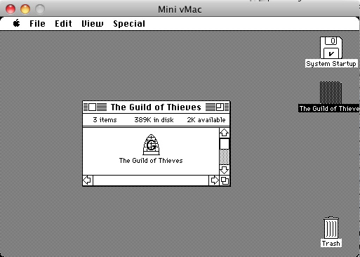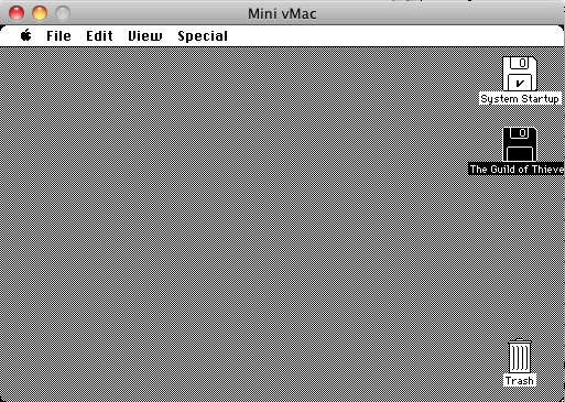 To load a game disk, just drag and drop the game disk image file onto the Mini vMac window. The disk loads automatically and an icon for the disk should appear on the desktop: