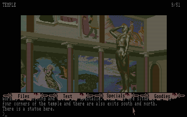 In this section you will find selected screenshots from "The Guild Of Thieves". Why only selected screenshots and not all of them? The Magnetic Scrolls games were, apart from their brilliant plots, all about what cool picture was going to come next. Showing all of them on this website would greatly spoil the fun, should you ever get the chance to play these games. |