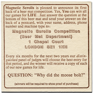 News News Archive Downloads Articles Links -------------------------- The Games - The Pawn - The Guild Of Thieves - Jinxter - Corruption - Fish! - Myth - Wonderland - The Magnetic Scrolls Collection Vol. One - The Legacy - Realm Of Terror -------------------------- Magnetic Interpreter -------------------------- The Message Board Guestbook -------------------------- About The Website Contact |